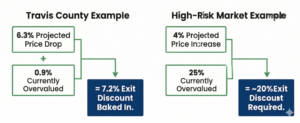 Translation: if we're buying an asset in Travis County with an anticipated 12-month hold, we need to price our exit at least 7% below current market value to protect the downside.